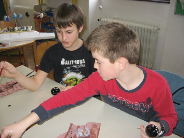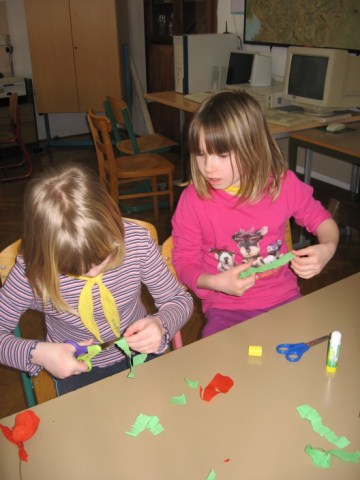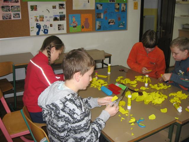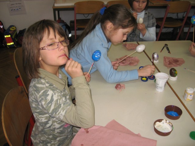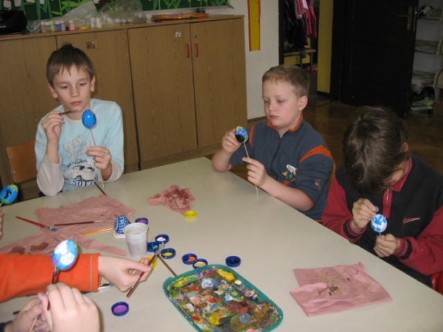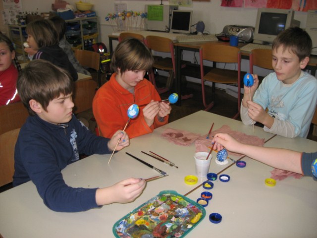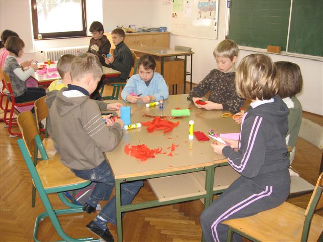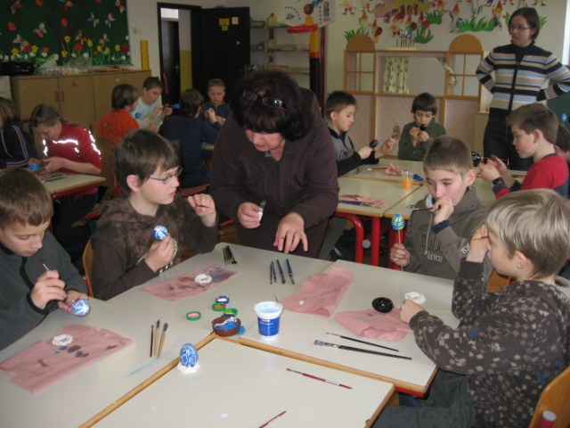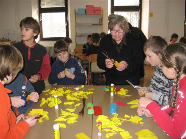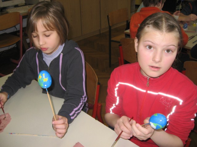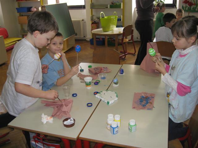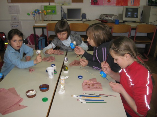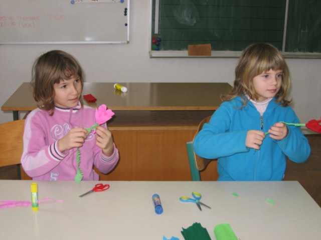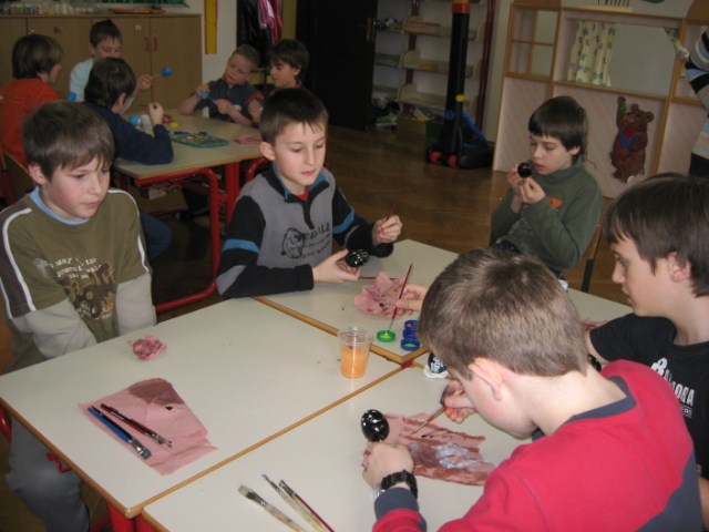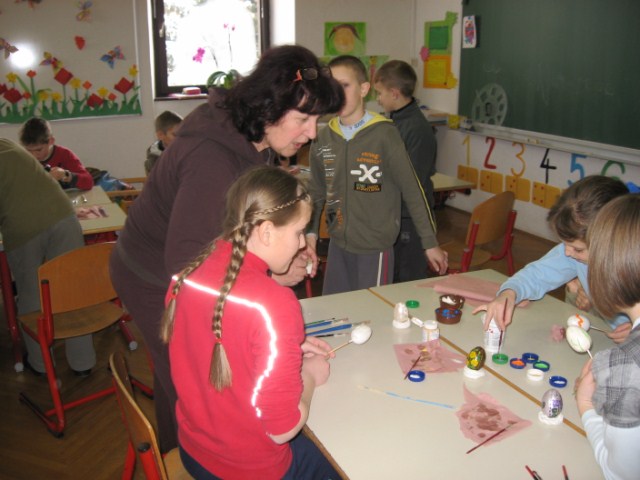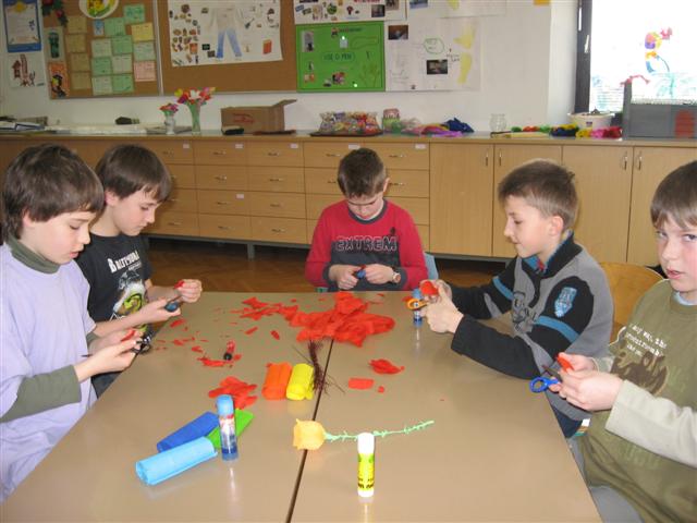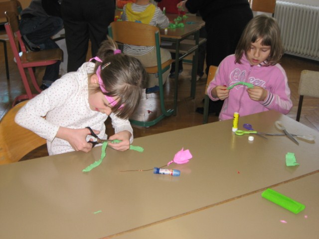Vsaka je imela svojo delavnico, učenci so bili razdeljeni v dve skupini. Vsak  učenec je naredil svojo rožo iz krep papirja in poslikal dva pirha. Obe gospe sta učencem z zvrhano mero ustvarjalnosti in potrpežljivosti svetovali in jih usmerjali pri delu.