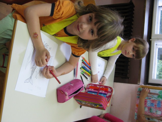 »Poslušamo pravljice, igramo računalnik, ustvarjamo, gledamo risanko, se igramo, barvamo pobarvanke, šilimo barvice in delamo izdelke. Pri podaljšanem bivanju mi je najbolj všeč, kadar ustvarjam.« Maša O.