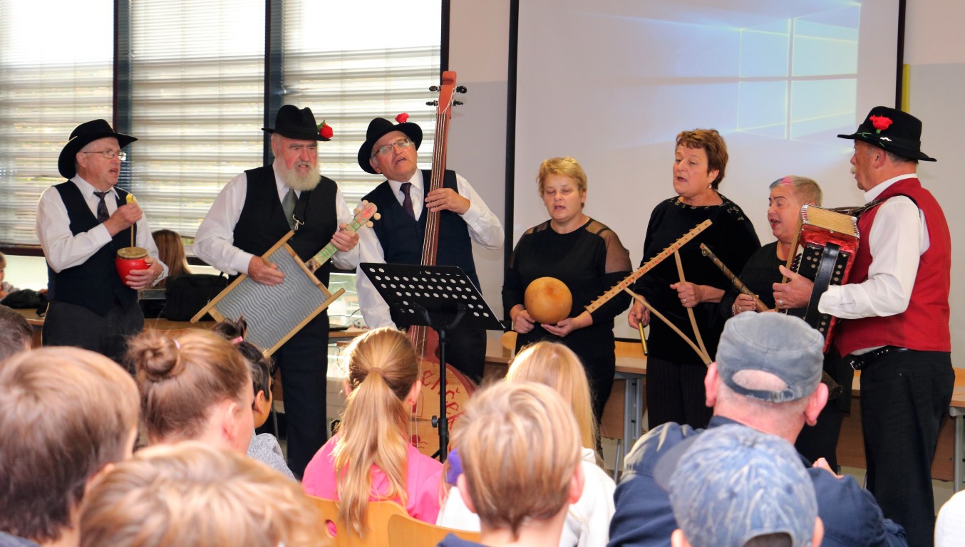 V uvodnem (skupnem) delu smo najprej prisluhnili glasbeni točki pevcev in godcev ljudskih pesmi Studenček, ki so s svojimi umetelno izdelanimi glasbili ter prečudovitimi glasovi poskrbeli za prijeten začetek našega dopoldanskega druženja.