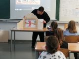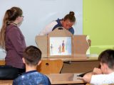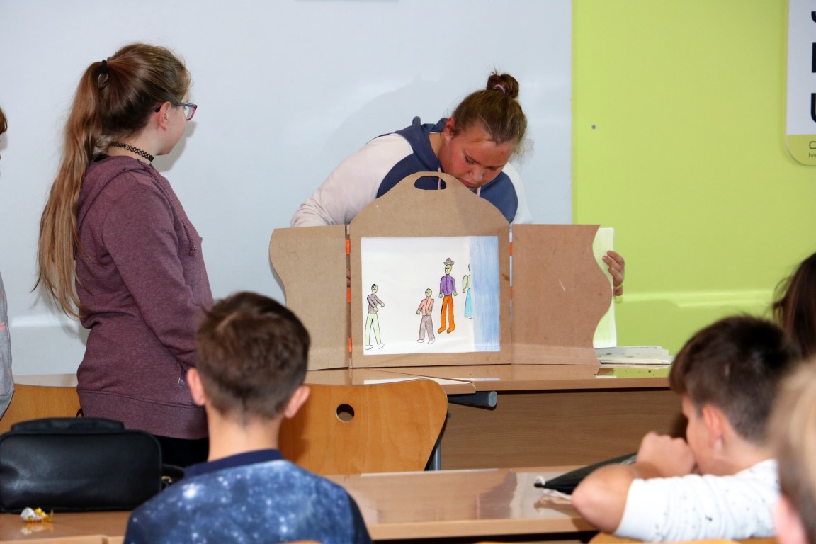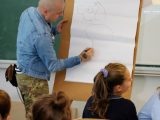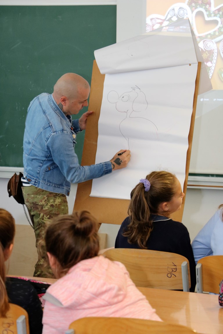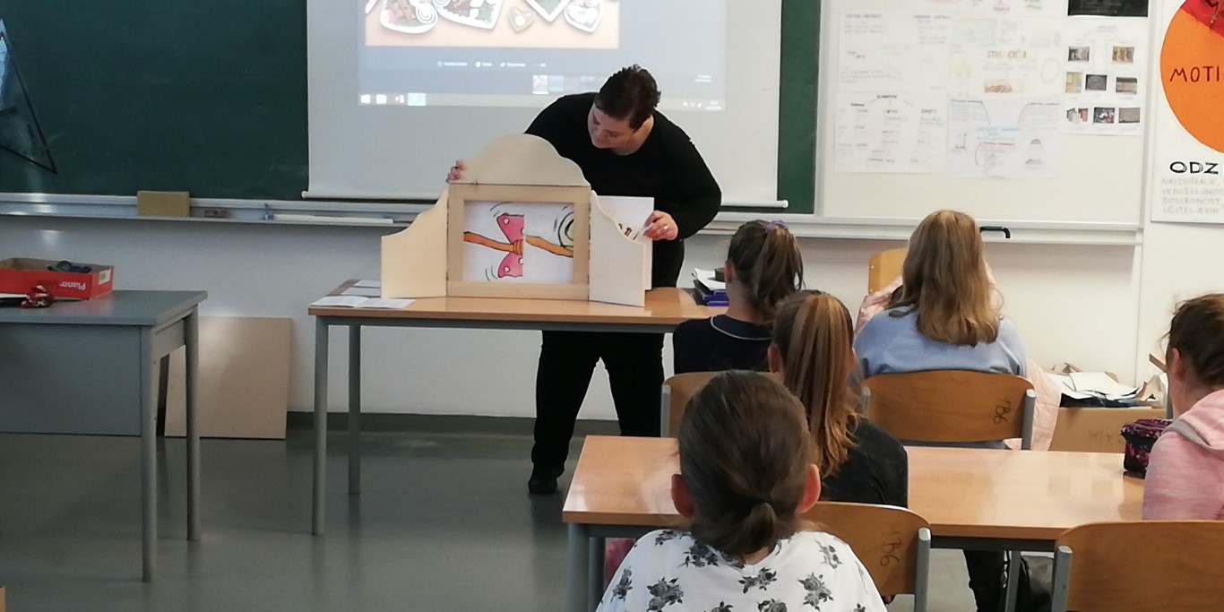 Ilustrator Gabrijel Vrhovec je učencem spregovoril nekaj besed o tem, kako nastaneta ilustracija ter strip. Poiskal je vzporednice med kamišibajem in stripom, kar je dalo učencem dodaten navdih za svoje delo.