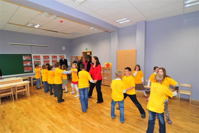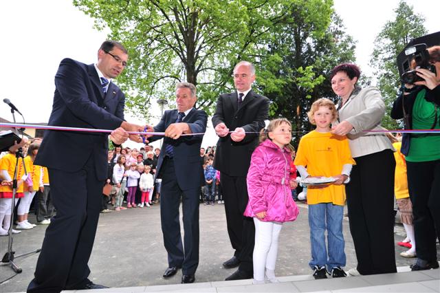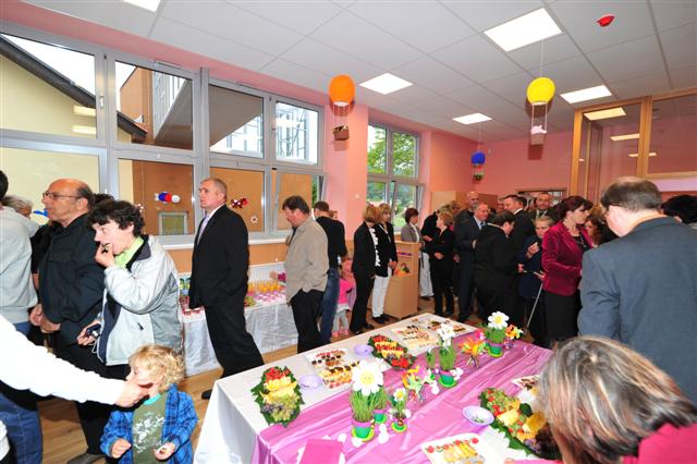 Tam pa pesem, blagoslov, prerez traku in skok čez prag nove šole. Obiskovalci so si lahko ogledali nove prostore vrtca in šole. Vsi prostori so opremljeni, tako vrtec, kot tudi šola pa smo poskrbeli, da ste poleg novih prostorov lahko videli še marsikaj. V šolskih prostorih so že čakali učenci, kateri obiskujejo PŠ na Krki in skupaj z učiteljicami prikazali utrinke učne ure v današnjem času. Na hodniku, kjer bo v novem šolske letu knjižnica, so učenci PŠ Krka pripravili bazar, namenjen odprtju nove šole. V zbornici so bili razstavljeni predmeti  in fotografije še iz časa, ko je stavba bila tovarna – šiviljski obrat. Na ogled smo ponudili tudi dve diaprojekciji. Prva je prikazovala postopke gradnje nove šole, druga pa življenje učencev in učiteljic v letošnjem šolskem letu.